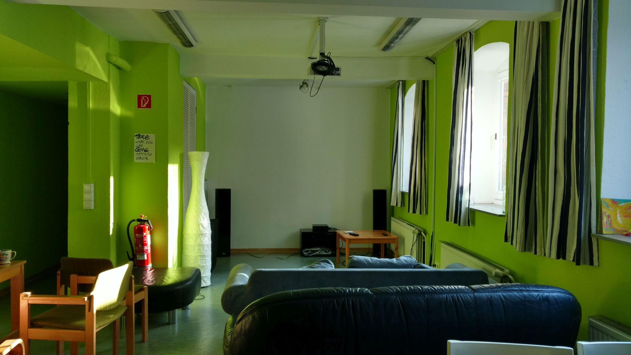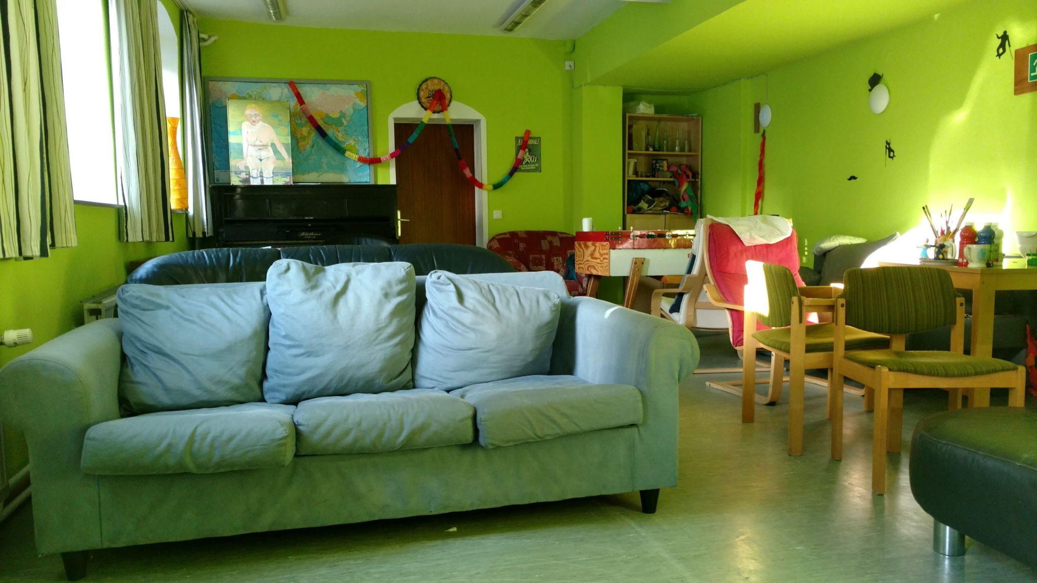 Im Untergeschoss des Hauses stehen zwei große Gemeinschaftsräume offen für allen Bewohner*innen - mit Sofaecke, Bar und Klavier. Hier finden gesellige Runden und Partys statt. Eine Zeit, die unvergesslich bleibt.